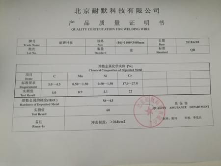 圖(1)堆焊耐磨襯板的合金成分材質(zhì)單也是產(chǎn)品質(zhì)量證明書