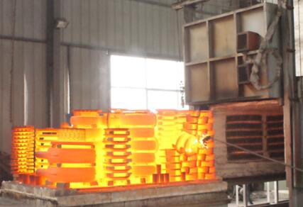 高鉻耐磨襯板的材料成分高鉻鑄鐵,技術(shù)要求為平面度公差+0.2mm,圓度公差+0.1mm,硬度為60~65HRC。其關(guān)鍵技術(shù)是熱處理變形 ,冷加工產(chǎn)生變形4mm,淬火后平面翹曲更大。利用鋼在相變中呈現(xiàn)短時塑性偏高的現(xiàn)象,即相變超塑性效應(yīng),采取平臺加壓淬火法,效果好,解決了淬火變形,滿足了技術(shù)要求。